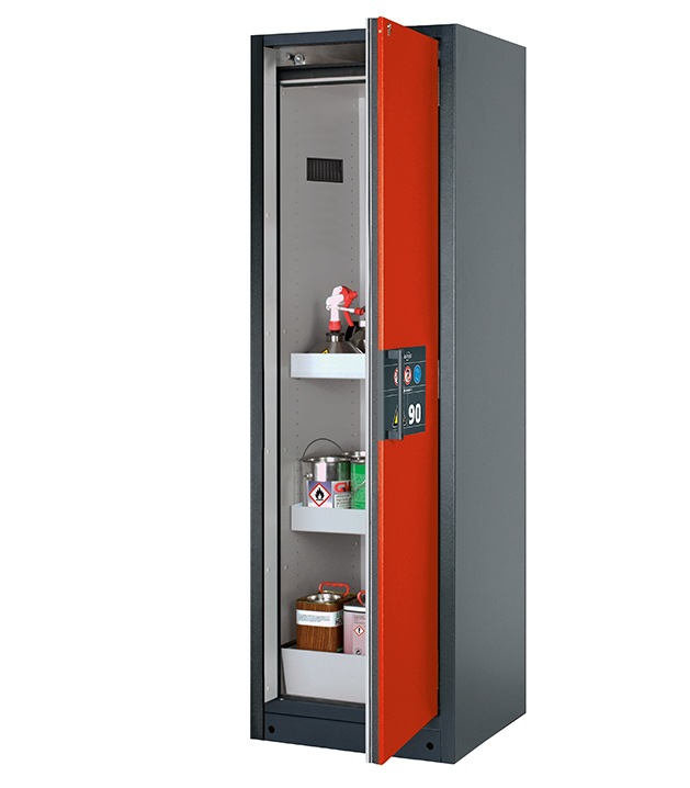 Korpusfarbe Anthrazitgrau (RAL 7016), mit Flügeltür in Verkehrsrot (RAL 3020), Inneneinrichtung mit 2 x Wannenboden, 1 x Lochblecheinsatz, 1 x Bodenauffangwanne (Stahlblech pulverbeschichtet)