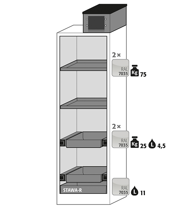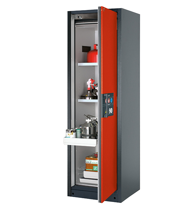 Korpusfarbe Anthrazitgrau (RAL 7016), mit Flügeltür in Verkehrsrot (RAL 3020), Inneneinrichtung mit 2 x Fachboden, 2 x Auszugswanne, 1 x Bodenauffangwanne (Stahlblech pulverbeschichtet)
