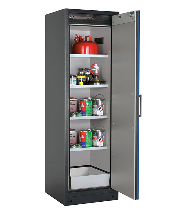 Korpusfarbe Anthrazitgrau (RAL 7016), mit Flügeltür in Enzianblau (RAL 5010), Inneneinrichtung mit 4 x Fachboden, 1 x Bodenauffangwanne (Stahlblech pulverbeschichtet)