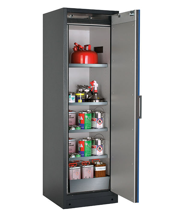 Korpusfarbe Anthrazitgrau (RAL 7016), mit Flügeltür in Enzianblau (RAL 5010), Inneneinrichtung mit 4 x Fachboden (Edelstahl 1.4301), 1 x Lochblecheinsatz, 1 x Bodenauffangwanne (Edelstahl 1.4016)
