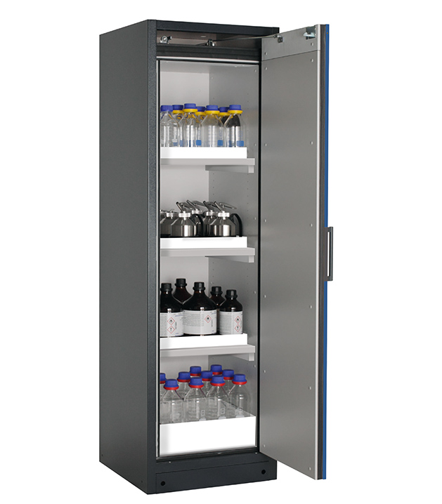 Korpusfarbe Anthrazitgrau (RAL 7016), mit Flügeltür in Enzianblau (RAL 5010), Inneneinrichtung mit 3 x Wannenboden, 1 x Bodenauffangwanne (PP)