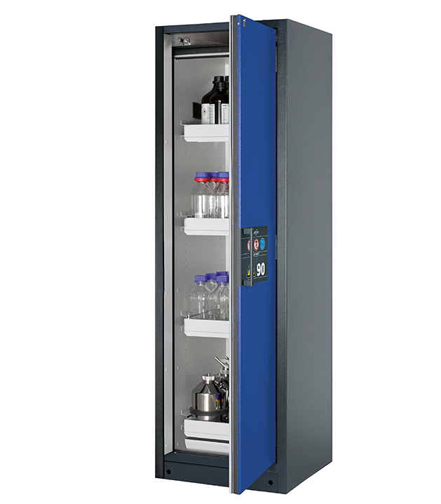 Korpusfarbe Anthrazitgrau (RAL 7016), mit Flügeltür in Enzianblau (RAL 5010), Inneneinrichtung mit 4 x Auszugswanne, 1 x Bodenauffangwanne (Stahlblech pulverbeschichtet)