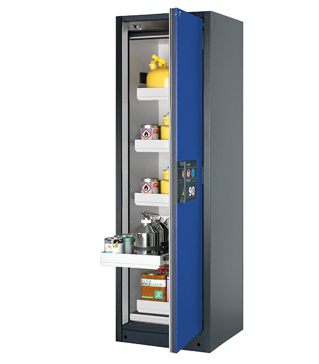 Korpusfarbe Anthrazitgrau (RAL 7016), mit Flügeltür in Enzianblau (RAL 5010), Inneneinrichtung mit 5 x Auszugswanne, 1 x Bodenauffangwanne (Stahlblech pulverbeschichtet)