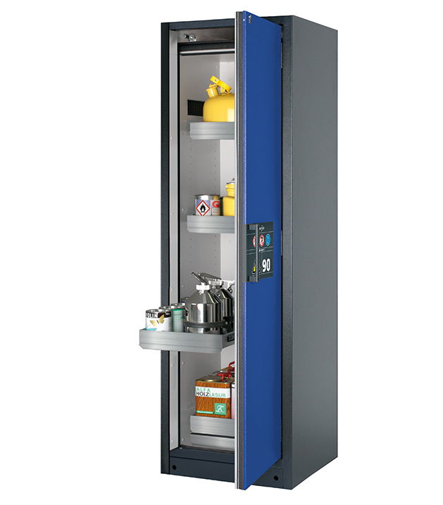 Korpusfarbe Anthrazitgrau (RAL 7016), mit Flügeltür in Enzianblau (RAL 5010), Inneneinrichtung mit 4 x Auszugswanne (Edelstahl 1.4301), 1 x Bodenauffangwanne (Edelstahl 1.4016)