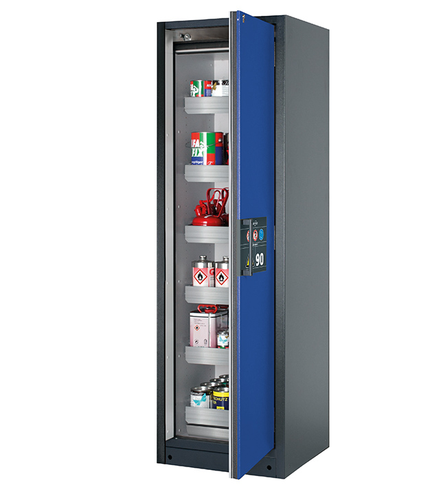 Korpusfarbe Anthrazitgrau (RAL 7016), mit Flügeltür in Enzianblau (RAL 5010), Inneneinrichtung mit 6 x Auszugswanne (Edelstahl 1.4301), 1 x Bodenauffangwanne (Edelstahl 1.4016)