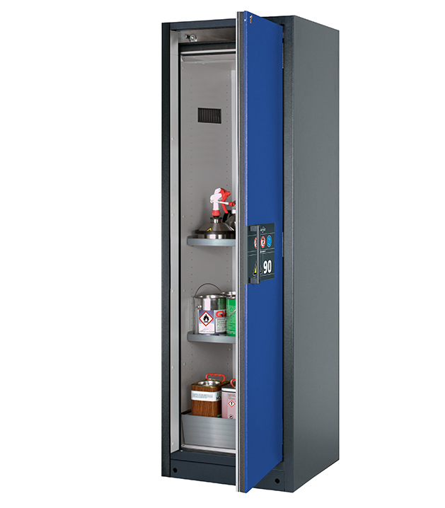 Korpusfarbe Anthrazitgrau (RAL 7016), mit Flügeltür in Enzianblau (RAL 5010), Inneneinrichtung mit 2 x Fachboden (Edelstahl 1.4301), 1 x Lochblecheinsatz, 1 x Bodenauffangwanne (Edelstahl 1.4016)