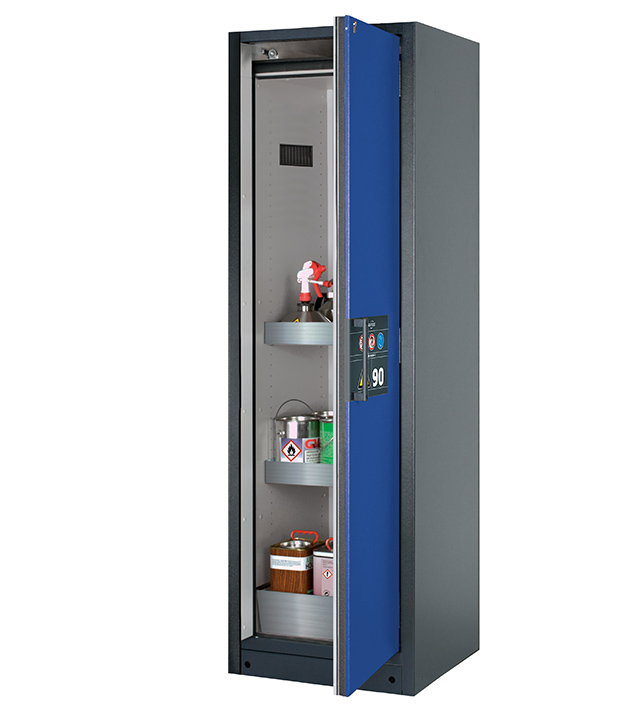 Korpusfarbe Anthrazitgrau (RAL 7016), mit Flügeltür in Enzianblau (RAL 5010), Inneneinrichtung mit 2 x Wannenboden (Edelstahl 1.4301), 1 x Lochblecheinsatz (Edelstahl 1.4016), 1 x Bodenauffangwanne (Edelstahl 1.4301)
