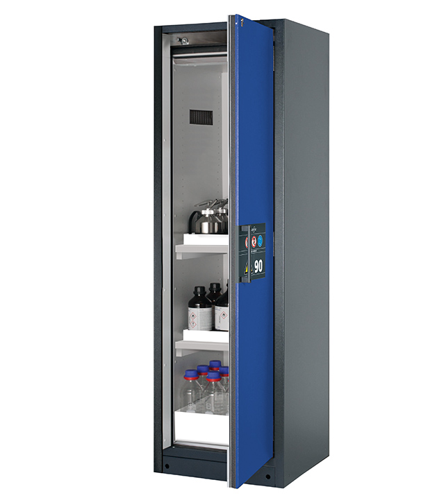 Korpusfarbe Anthrazitgrau (RAL 7016), mit Flügeltür in Enzianblau (RAL 5010), Inneneinrichtung mit 2 x Wannenboden, 1 x Bodenauffangwanne (PP)