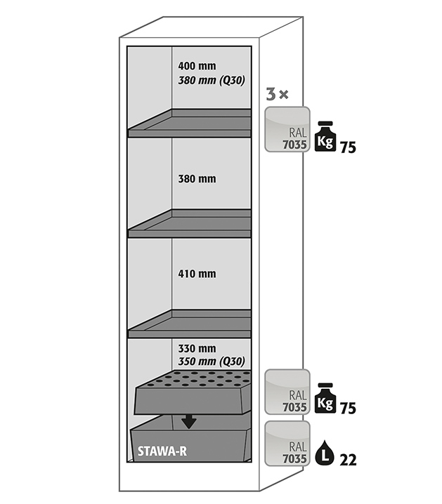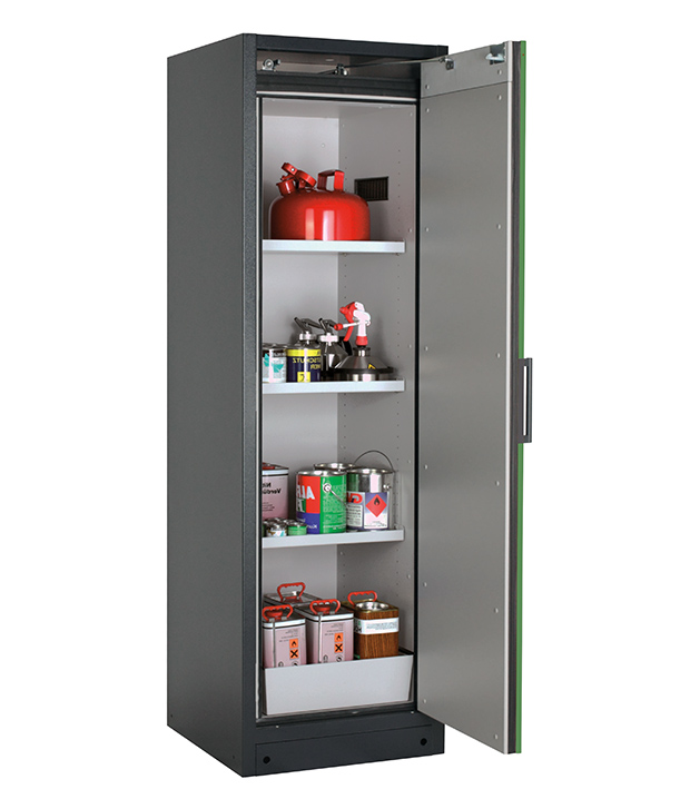 Korpusfarbe Anthrazitgrau (RAL 7016), mit Flügeltür in Resedagrün (RAL 6011), Inneneinrichtung mit 3 x Fachboden, 1 x Lochblecheinsatz, 1 x Bodenauffangwanne (Stahlblech pulverbeschichtet)