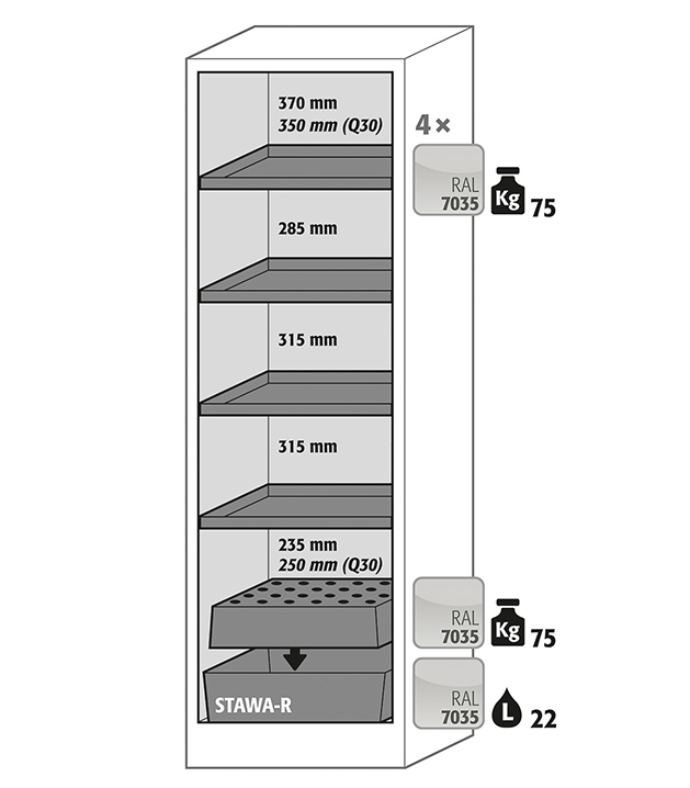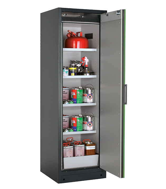 Korpusfarbe Anthrazitgrau (RAL 7016), mit Flügeltür in Resedagrün (RAL 6011), Inneneinrichtung mit 4 x Fachboden, 1 x Lochblecheinsatz, 1 x Bodenauffangwanne (Stahlblech pulverbeschichtet)