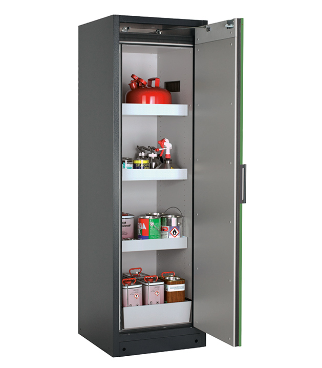Korpusfarbe Anthrazitgrau (RAL 7016), mit Flügeltür in Resedagrün (RAL 6011), Inneneinrichtung mit 3 x Wannenboden, 1 x Lochblecheinsatz, 1 x Bodenauffangwanne (Stahlblech pulverbeschichtet)