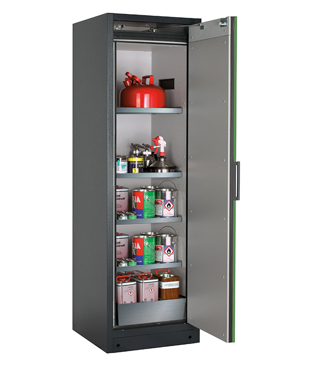 Korpusfarbe Anthrazitgrau (RAL 7016), mit Flügeltür in Resedagrün (RAL 6011), Inneneinrichtung mit 4 x Fachboden (Edelstahl 1.4301), 1 x Lochblecheinsatz, 1 x Bodenauffangwanne (Edelstahl 1.4016)