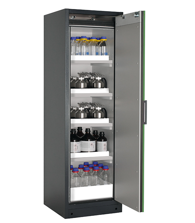 Korpusfarbe Anthrazitgrau (RAL 7016), mit Flügeltür in Resedagrün (RAL 6011), Inneneinrichtung mit 4 x Wannenboden, 1 x Bodenauffangwanne (PP)