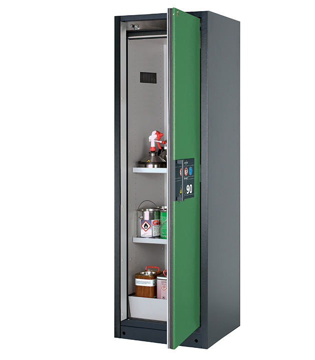 Korpusfarbe Anthrazitgrau (RAL 7016), mit Flügeltür in Resedagrün (RAL 6011), Inneneinrichtung mit 2 x Fachboden, 1 x Lochblecheinsatz, 1 x Bodenauffangwanne (Stahlblech pulverbeschichtet)