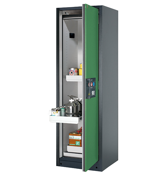 Korpusfarbe Anthrazitgrau (RAL 7016), mit Flügeltür in Resedagrün (RAL 6011), Inneneinrichtung mit 3 x Auszugswanne, 1 x Bodenauffangwanne (Stahlblech pulverbeschichtet)