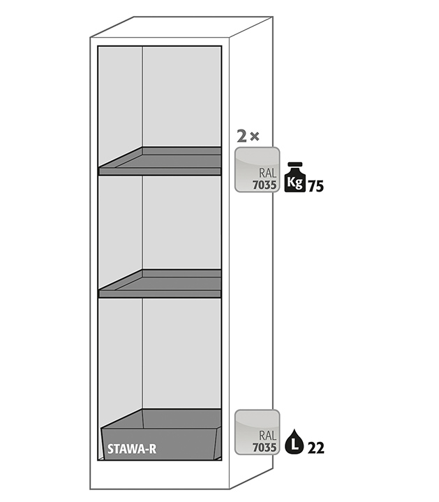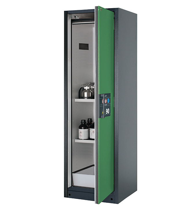 Korpusfarbe Anthrazitgrau (RAL 7016), mit Flügeltür in Resedagrün (RAL 6011), Inneneinrichtung mit 2 x Fachboden, 1 x Bodenauffangwanne (Stahlblech pulverbeschichtet)