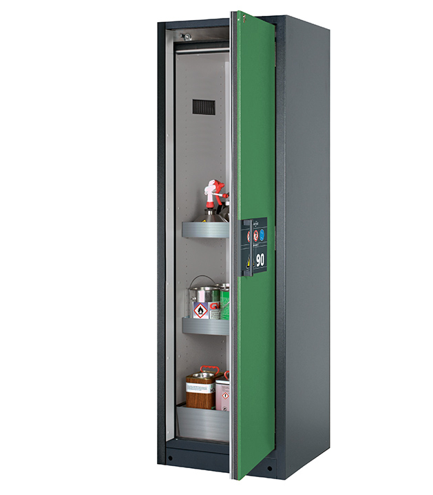 Korpusfarbe Anthrazitgrau (RAL 7016), mit Flügeltür in Resedagrün (RAL 6011), Inneneinrichtung mit 2 x Wannenboden (Edelstahl 1.4301), 1 x Lochblecheinsatz (Edelstahl 1.4016), 1 x Bodenauffangwanne (Edelstahl 1.4301)