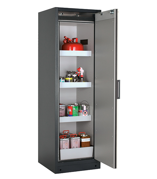 Korpusfarbe Anthrazitgrau (RAL 7016), mit Flügeltür in asecos Silber, Inneneinrichtung mit 3 x Wannenboden, 1 x Lochblecheinsatz, 1 x Bodenauffangwanne (Stahlblech pulverbeschichtet)