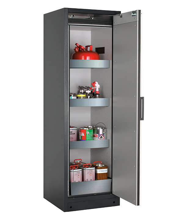 Korpusfarbe Anthrazitgrau (RAL 7016), mit Flügeltür in asecos Silber, Inneneinrichtung mit 3 x Wannenboden (Edelstahl 1.4301), 1 x Lochblecheinsatz (Edelstahl 1.4016), 1 x Bodenauffangwanne (Edelstahl 1.4301)