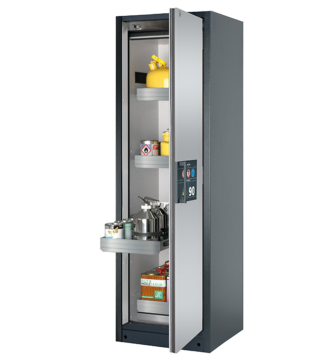 Korpusfarbe Anthrazitgrau (RAL 7016), mit Flügeltür in asecos Silber, Inneneinrichtung mit 4 x Auszugswanne (Edelstahl 1.4301), 1 x Bodenauffangwanne (Edelstahl 1.4016)