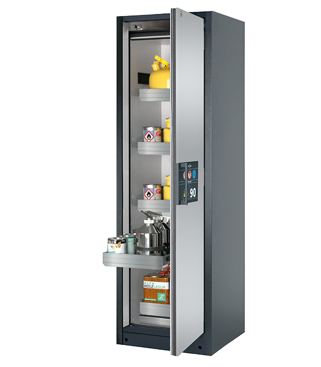 Korpusfarbe Anthrazitgrau (RAL 7016), mit Flügeltür in asecos Silber, Inneneinrichtung mit 5 x Auszugswanne (Edelstahl 1.4301), 1 x Bodenauffangwanne (Edelstahl 1.4016)