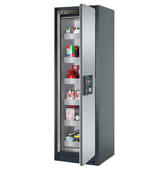 Korpusfarbe Anthrazitgrau (RAL 7016), mit Flügeltür in asecos Silber, Inneneinrichtung mit 6 x Auszugswanne (Edelstahl 1.4301), 1 x Bodenauffangwanne (Edelstahl 1.4016)