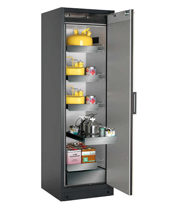 Korpusfarbe Anthrazitgrau (RAL 7016), mit Flügeltür in asecos Silber, Inneneinrichtung mit 4 x Auszugswanne, 1 x Auszugswanne Entsorgung (Edelstahl 1.4301), 1 x Bodenauffangwanne (Edelstahl 1.4016)