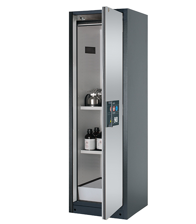 Korpusfarbe Anthrazitgrau (RAL 7016), mit Flügeltür in asecos Silber, Inneneinrichtung mit 2 x Fachboden, 1 x Bodenauffangwanne (Stahlblech pulverbeschichtet)