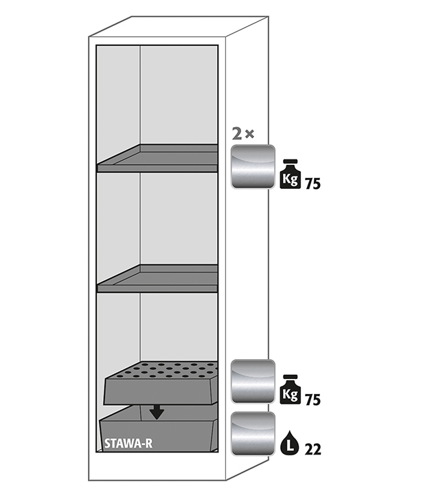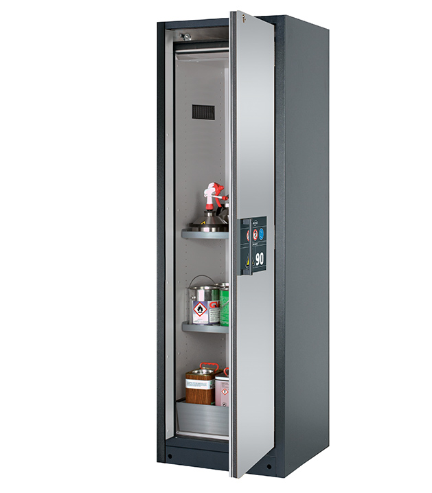 Korpusfarbe Anthrazitgrau (RAL 7016), mit Flügeltür in asecos Silber, Inneneinrichtung mit 2 x Fachboden (Edelstahl 1.4301), 1 x Lochblecheinsatz, 1 x Bodenauffangwanne (Edelstahl 1.4016)