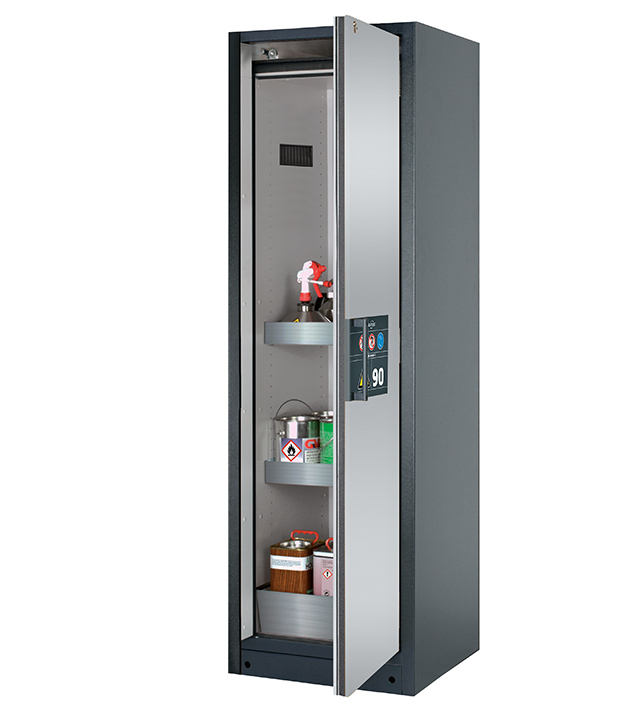 Korpusfarbe Anthrazitgrau (RAL 7016), mit Flügeltür in asecos Silber, Inneneinrichtung mit 2 x Wannenboden (Edelstahl 1.4301), 1 x Lochblecheinsatz (Edelstahl 1.4016), 1 x Bodenauffangwanne (Edelstahl 1.4301)