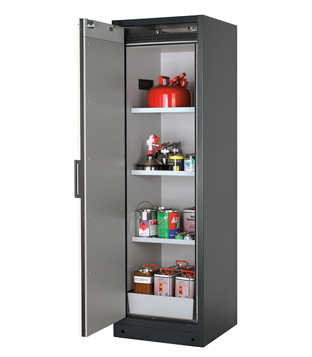 Korpusfarbe Anthrazitgrau (RAL 7016), mit Flügeltür in Reinweiß (RAL 9010), Inneneinrichtung mit 3 x Fachboden, 1 x Lochblecheinsatz, 1 x Bodenauffangwanne (Stahlblech pulverbeschichtet)
