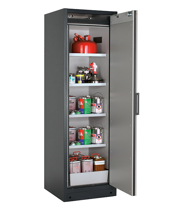 Korpusfarbe Anthrazitgrau (RAL 7016), mit Flügeltür in Reinweiß (RAL 9010), Inneneinrichtung mit 4 x Fachboden, 1 x Lochblecheinsatz, 1 x Bodenauffangwanne (Stahlblech pulverbeschichtet)