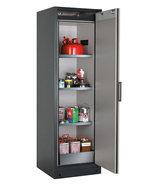 Korpusfarbe Anthrazitgrau (RAL 7016), mit Flügeltür in Reinweiß (RAL 9010), Inneneinrichtung mit 3 x Fachboden (Edelstahl 1.4301), 1 x Lochblecheinsatz, 1 x Bodenauffangwanne (Edelstahl 1.4016)
