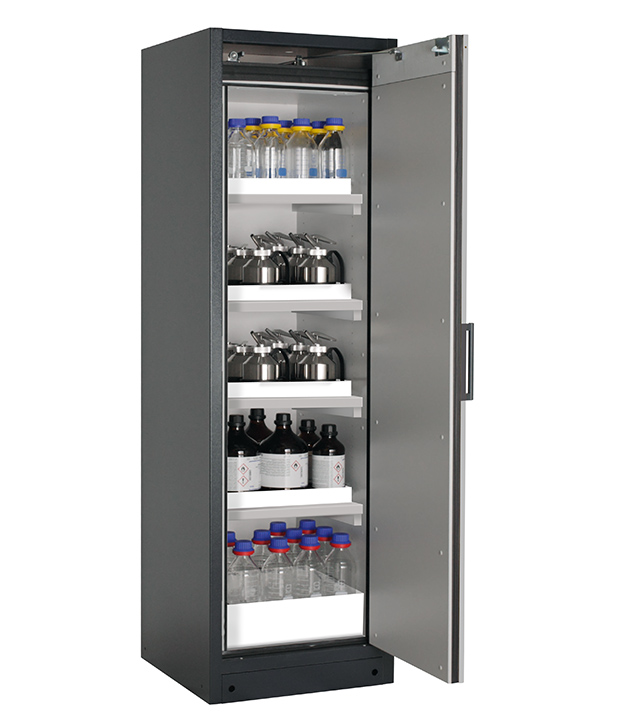 Korpusfarbe Anthrazitgrau (RAL 7016), mit Flügeltür in Reinweiß (RAL 9010), Inneneinrichtung mit 4 x Wannenboden, 1 x Bodenauffangwanne (PP)