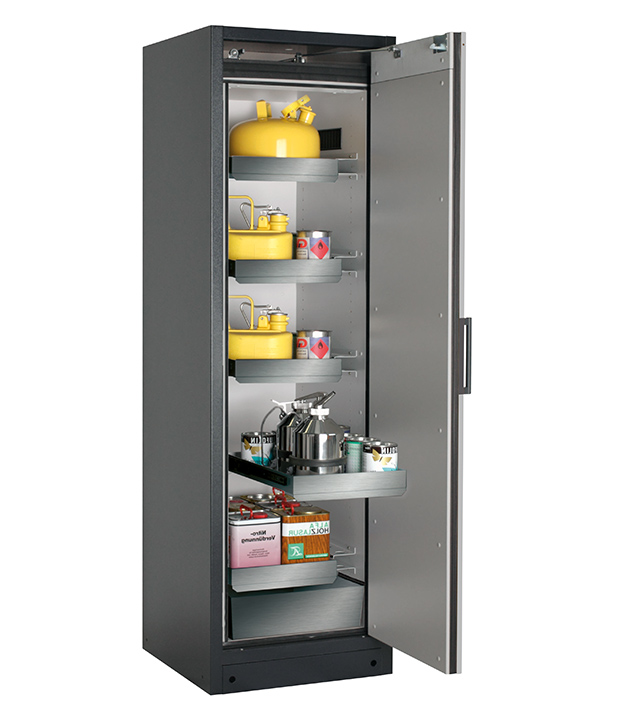 Korpusfarbe Anthrazitgrau (RAL 7016), mit Flügeltür in Reinweiß (RAL 9010), Inneneinrichtung mit 4 x Auszugswanne, 1 x Auszugswanne Entsorgung (Edelstahl 1.4301), 1 x Bodenauffangwanne (Edelstahl 1.4016)