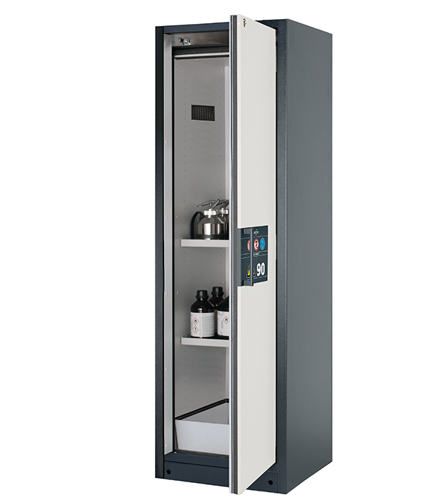 Korpusfarbe Anthrazitgrau (RAL 7016), mit Flügeltür in Reinweiß (RAL 9010), Inneneinrichtung mit 2 x Fachboden, 1 x Bodenauffangwanne (Stahlblech pulverbeschichtet)