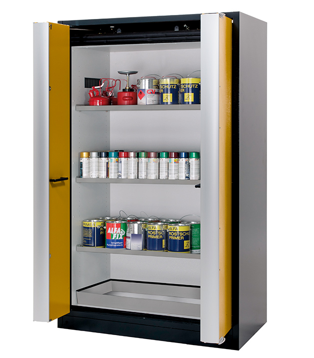 Korpusfarbe Anthrazitgrau (RAL 7016), mit Falttüren in Sicherheitsgelb (RAL 1004), Inneneinrichtung mit 3 x Fachboden (Edelstahl 1.4301), 1 x Bodenauffangwanne (Edelstahl 1.4016)