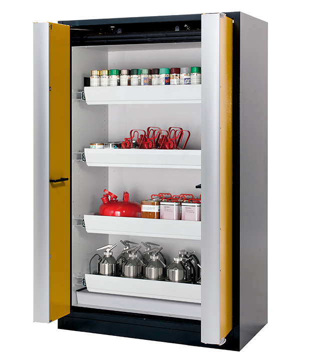 Korpusfarbe Anthrazitgrau (RAL 7016), mit Falttüren in Sicherheitsgelb (RAL 1004), Inneneinrichtung mit 4 x Auszugswanne, 1 x Bodenauffangwanne (Stahlblech pulverbeschichtet)