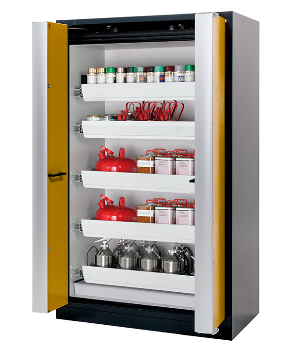Korpusfarbe Anthrazitgrau (RAL 7016), mit Falttüren in Sicherheitsgelb (RAL 1004), Inneneinrichtung mit 5 x Auszugswanne, 1 x Bodenauffangwanne (Stahlblech pulverbeschichtet)