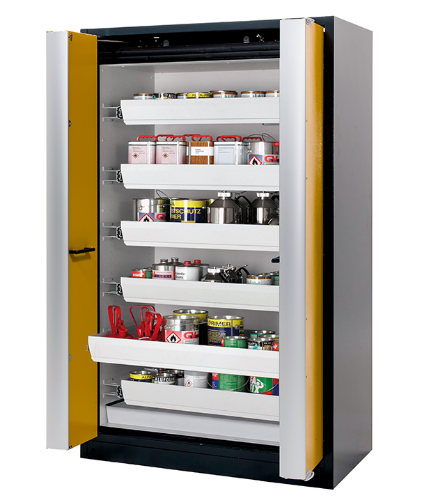 Korpusfarbe Anthrazitgrau (RAL 7016), mit Falttüren in Sicherheitsgelb (RAL 1004), Inneneinrichtung mit 6 x Auszugswanne, 1 x Bodenauffangwanne (Stahlblech pulverbeschichtet)