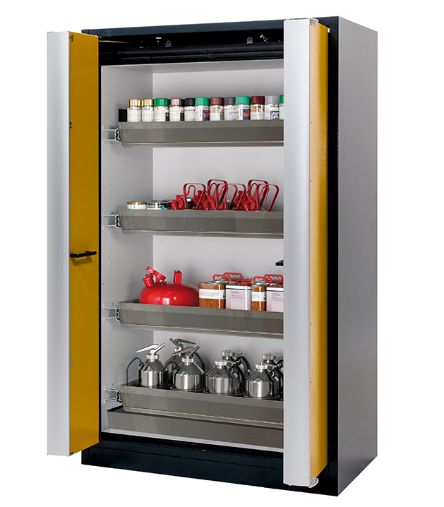 Korpusfarbe Anthrazitgrau (RAL 7016), mit Falttüren in Sicherheitsgelb (RAL 1004), Inneneinrichtung mit 4 x Auszugswanne (Edelstahl 1.4301), 1 x Bodenauffangwanne (Edelstahl 1.4016)