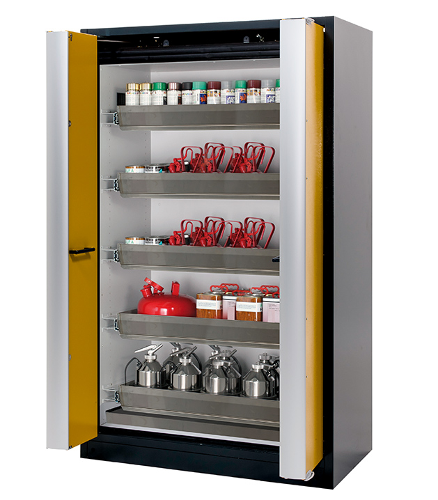 Korpusfarbe Anthrazitgrau (RAL 7016), mit Falttüren in Sicherheitsgelb (RAL 1004), Inneneinrichtung mit 5 x Auszugswanne (Edelstahl 1.4301), 1 x Bodenauffangwanne (Edelstahl 1.4016)