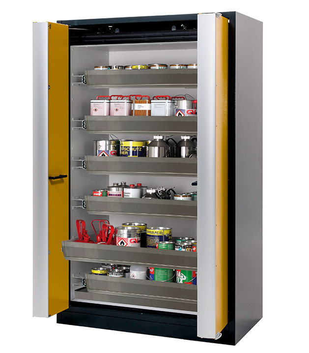 Korpusfarbe Anthrazitgrau (RAL 7016), mit Falttüren in Sicherheitsgelb (RAL 1004), Inneneinrichtung mit 6 x Auszugswanne (Edelstahl 1.4301), 1 x Bodenauffangwanne (Edelstahl 1.4016)