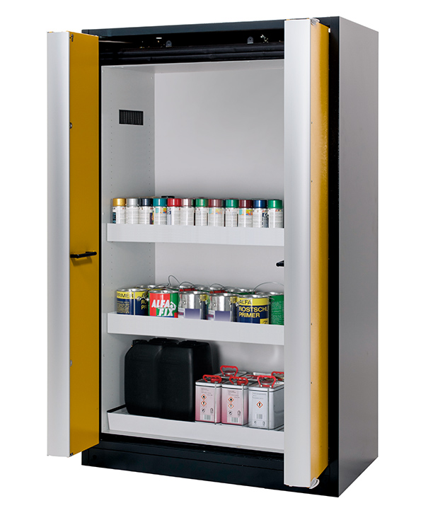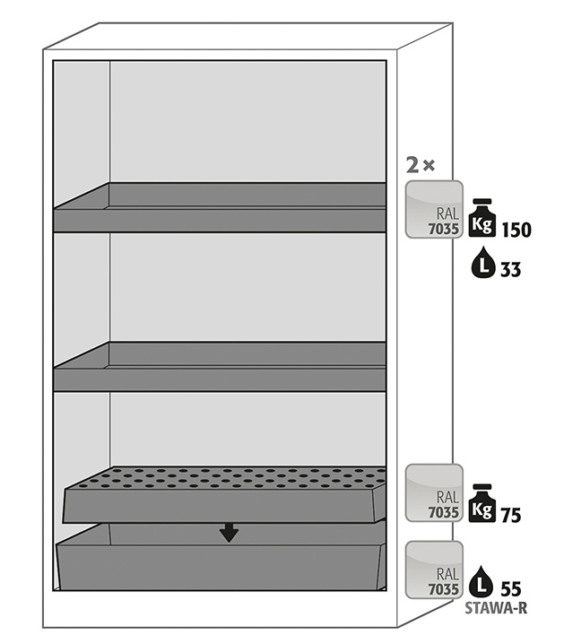 Korpusfarbe Anthrazitgrau (RAL 7016), mit Falttüren in Sicherheitsgelb (RAL 1004), Inneneinrichtung mit 2 x Wannenboden, 1 x Lochblecheinsatz, 1 x Bodenauffangwanne (Stahlblech pulverbeschichtet)