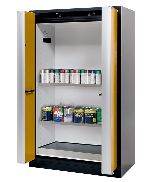 Korpusfarbe Anthrazitgrau (RAL 7016), mit Falttüren in Sicherheitsgelb (RAL 1004), Inneneinrichtung mit 2 x Fachboden (Edelstahl 1.4301), 1 x Bodenauffangwanne (Edelstahl 1.4016)