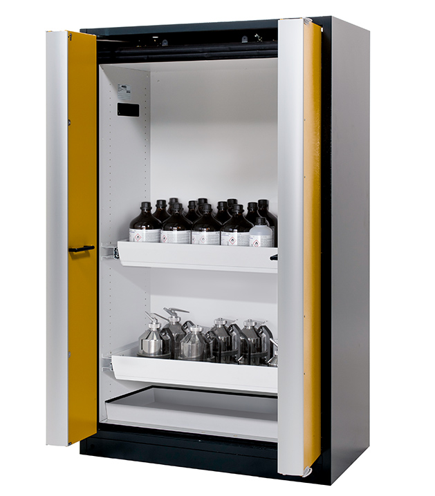 Korpusfarbe Anthrazitgrau (RAL 7016), mit Falttüren in Sicherheitsgelb (RAL 1004), Inneneinrichtung mit 2 x Auszugswanne, 1 x Bodenauffangwanne (Stahlblech pulverbeschichtet)