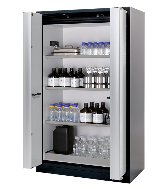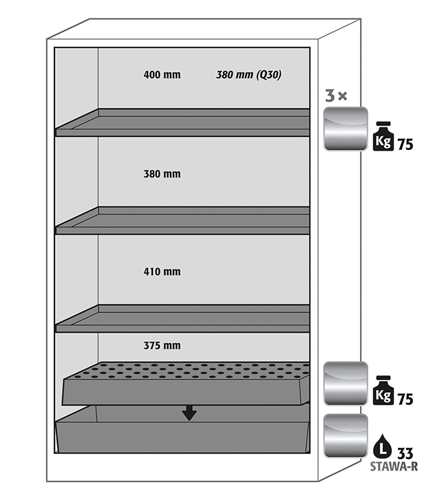 Korpusfarbe Anthrazitgrau (RAL 7016), mit Falttüren in Lichtgrau (RAL 7035), Inneneinrichtung mit 3 x Fachboden (Edelstahl 1.4301), 1 x Lochblecheinsatz, 1 x Bodenauffangwanne (Edelstahl 1.4016)