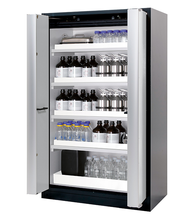 Korpusfarbe Anthrazitgrau (RAL 7016), mit Falttüren in Lichtgrau (RAL 7035), Inneneinrichtung mit 4 x Wannenboden, 1 x Bodenauffangwanne (PP)