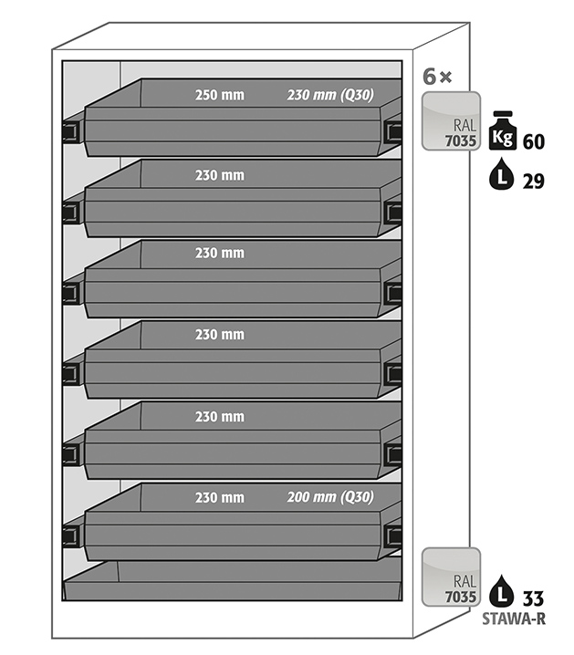 Korpusfarbe Anthrazitgrau (RAL 7016), mit Falttüren in Lichtgrau (RAL 7035), Inneneinrichtung mit 6 x Auszugswanne, 1 x Bodenauffangwanne (Stahlblech pulverbeschichtet)