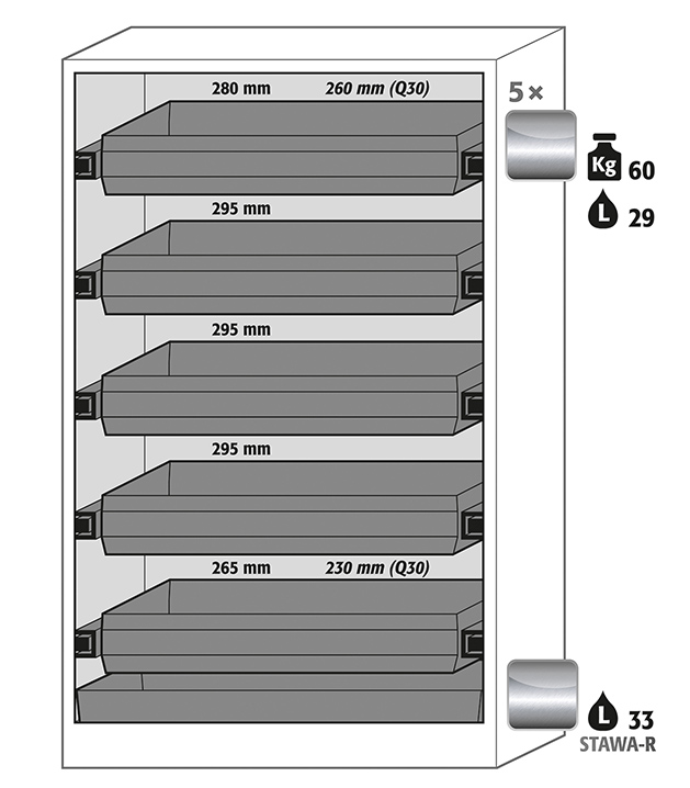 Korpusfarbe Anthrazitgrau (RAL 7016), mit Falttüren in Lichtgrau (RAL 7035), Inneneinrichtung mit 5 x Auszugswanne (Edelstahl 1.4301), 1 x Bodenauffangwanne (Edelstahl 1.4016)